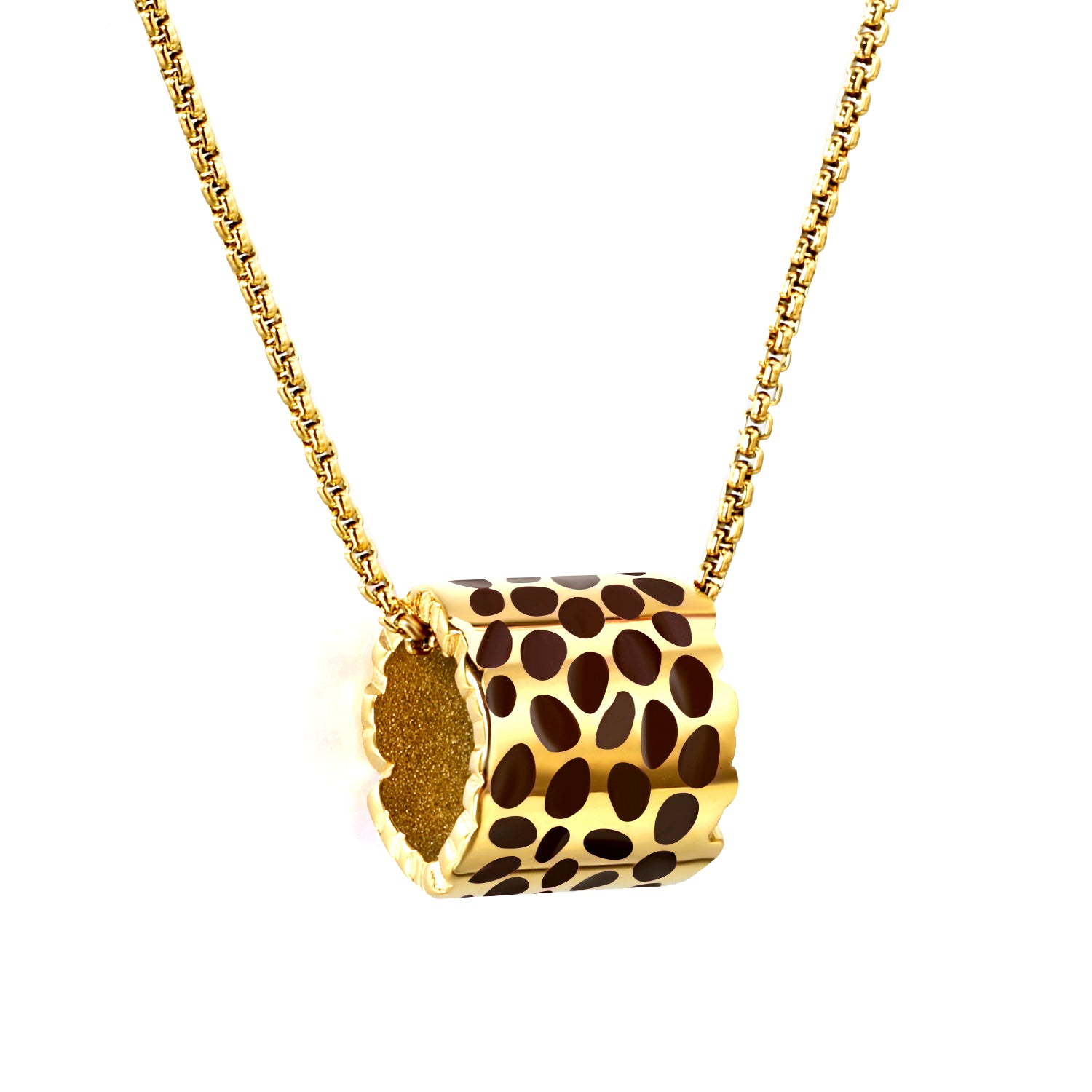 Atrévete a destacar con este colgante cilíndrico de acero inoxidable con baño de oro y estampado animal print. Su diseño moderno y audaz combina elegancia con un toque salvaje, ideal para mujeres que disfrutan marcar tendencia.