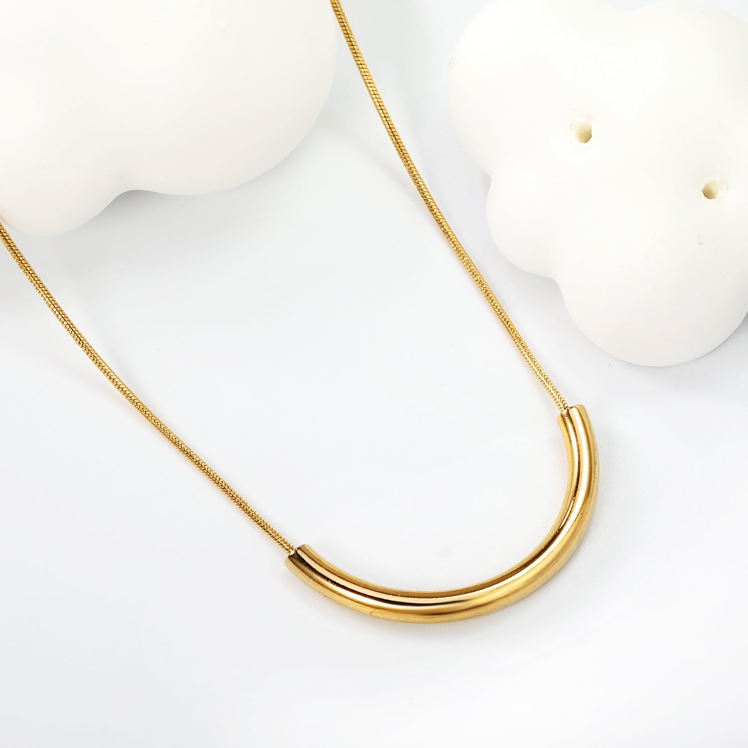 La sencillez se convierte en lujo con este collar dorado de diseño curvo. Una pieza moderna y sofisticada que abraza el cuello con una forma limpia y elegante. Fabricado en acero inoxidable hipoalergénico, es perfecto para quienes aman un estilo minimalista pero impactante.
